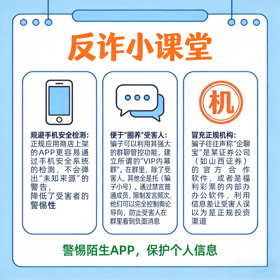 近期,一款名为“企聊宝”的软件频繁出现在全国多地的反诈预警通报中。从山西证券的紧急声明到惠州民政局的防骗指南,从宁夏中宁县的受害者到浙江杭州的吴亮律师的法律求助,“企聊宝”这个名字似乎总是与“刷单”、“彩票”、“无法提现”等词汇绑定在一起。